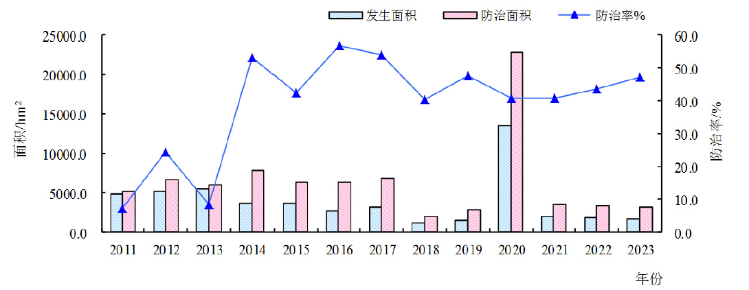 本研究选取2011—2023年陇东苹果种植区域最大最具有代表性的宁县气象观测资料和宁县农业技术推广中心苹果腐烂病资料,采用统计学方法、相关性分析法对陇东苹果腐烂病的发生机理进行分析研究。结果表明:对陇东苹果产量影响最严重的腐烂病发生在春季,3月下旬开始,4—5月发病最多,6月发病面积显著减少;其年际变化为2011—2013年为苹果腐烂病高发期,且发病面积呈逐年增加趋势;2014—2019年发生面积呈减小趋势,2018年为13 a来腐烂病发生的最小值,2020年是苹果腐烂病暴发的一年,实际发生面积达 13507 hm2,2021—2023年苹果腐烂病的发生面积逐渐减小;花期平均气温对腐烂病以正影响为主,膨大期以负影响为主;果实膨大期的最高气温对腐烂病以负影响为主;各个阶段的最低气温对腐烂病均以负影响为主;平均相对湿度在花期以负影响为主,在果实膨大期以正影响为主,降水量对腐烂病的影响主要表现在果实膨大期的正影响;风速、日照在花期为正影响,在果实膨大期为负影响;以影响显著的气象因子对春季高发时段建立多元线性回归模型,并对建立的回归模型进行检验,拟合值与实测结果变化基本一致,表明建立的该预报模型可以应用于陇东苹果腐烂病的预报预测中。本研究对于提高陇东果业产值及乡村经济振兴具有重大意义。
